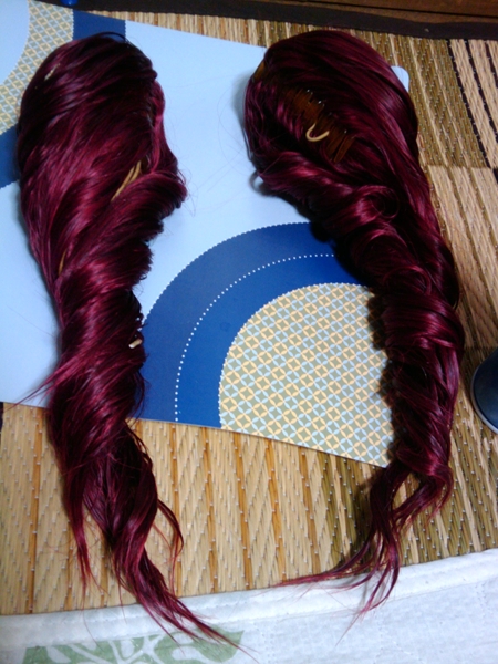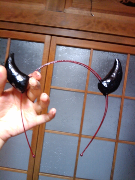 ニスが乾いたら黒と赤のマニキュアで塗装。 まぁまぁそれっぽいかな^^; 服に着けるときは安全ピンをそれぞれ3つずつくらい使えば それなりに安定しそうです^^ ツノも、針金部分(カチューシャ部分)を赤く染めれば完成!^^ さぁ!後は自分の衣装だけだw テトの髪はほんと面倒だなぁ・・・したくないなぁ・・・←