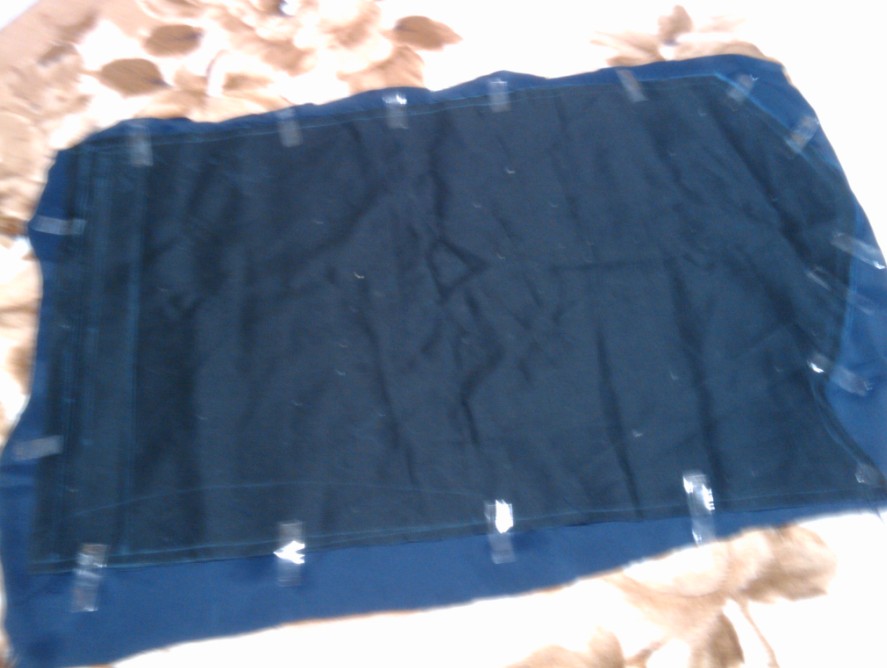 表地一枚裁断して 裏地は一枚完成。二枚目は途中 表地を型紙代わりにすると楽^^ チャコとかするときは セロハンテープフル活用! 針使うと段々が出来るからいやだし、針のあとがつくのもいや!